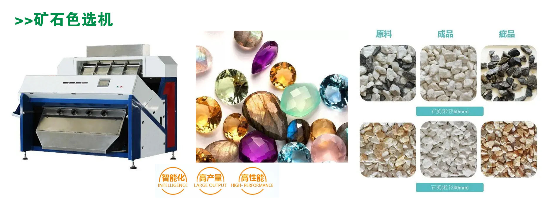 智能彩色寶石色選機(jī)是一種具有單、雙層結(jié)構(gòu)滑槽式精選設(shè)備。其中,前后 視可分別配備可見視鏡,采用了新的 CCD 彩色傳感器、色選定制的鏡頭、高速 FPGA 數(shù)據(jù) 處理器及高速電磁執(zhí)行機(jī)構(gòu),并使用了便于操作的帶觸摸功能的人機(jī)界面,是集光、機(jī)、電、 氣于一體的高科技產(chǎn)品??蓪⒈贿x物料中的雜質(zhì)自動剔除 ,具有選別精度高、效率高、操作 保養(yǎng)簡便、結(jié)構(gòu)緊湊、造型美觀等特點(diǎn)。廣泛用于糧食、油料、工業(yè)品等行業(yè) ,可適用于各種礦石精選。
